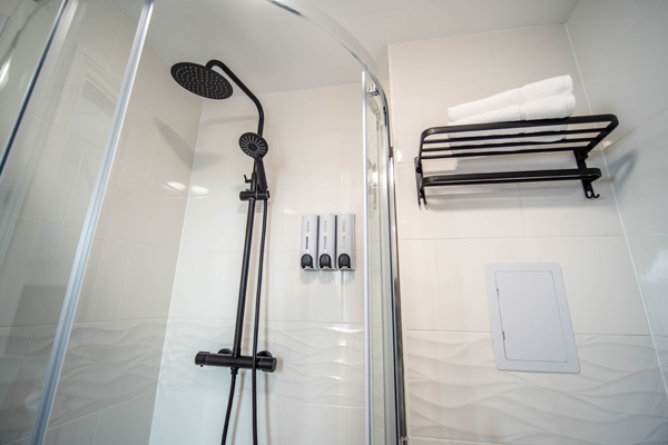 Casas de banho espaçosas: Casas de banho limpas e brilhantes com chuveiros potentes, toalhas macias e produtos de higiene pessoal gratuitos.